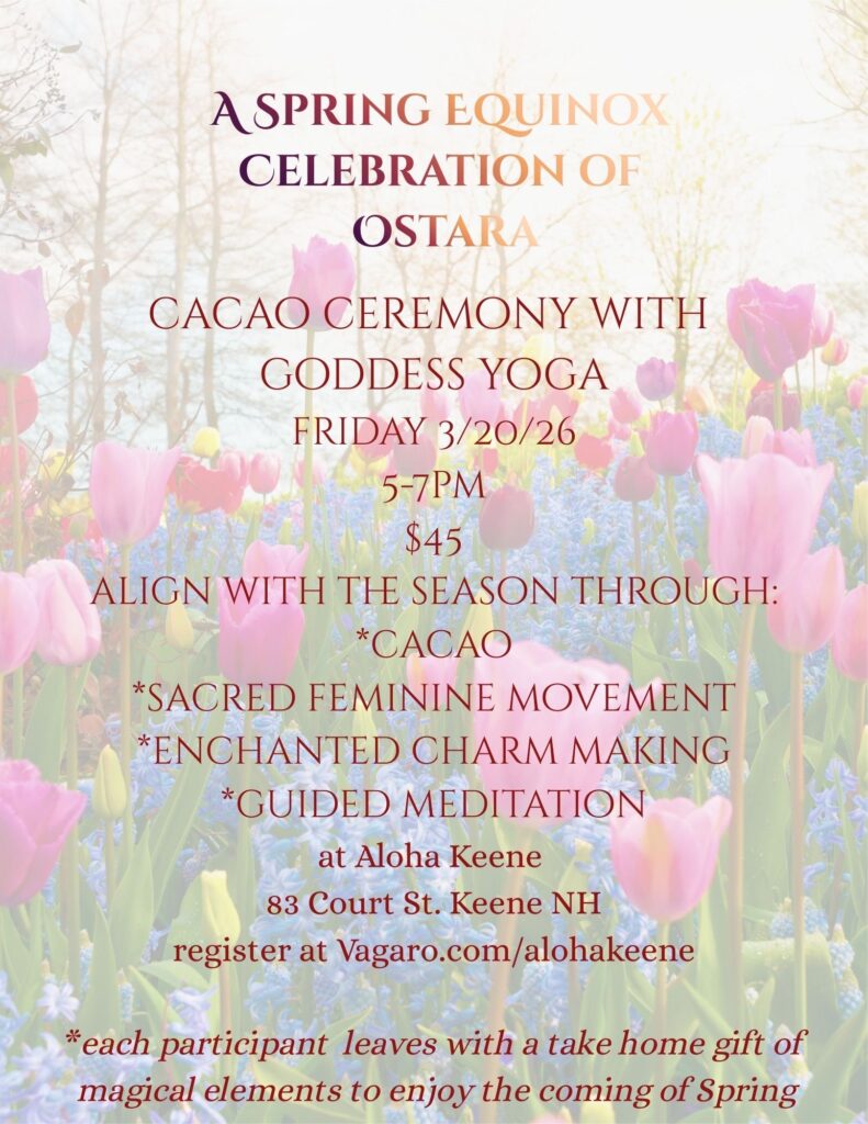 Experience a transformational Ostara with our Cacao Ceremony and Goddess Yoga class, where you’ll immerse yourself in the healing properties of cacao while connecting deeply with your inner goddess. Participants will also take home a personalized aromatherapy blend, enhancing the journey of relaxation and self-discovery.
